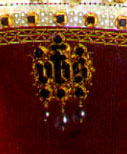 This brooch or pendant is three letters made of garnet or ruby, with three pearls suspended from the bottom.